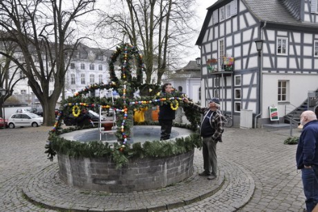 Angeregt hatte die Idee der Beigeordnete der Stadt Neuwied und Engerser, Jürgen Moritz, der die Tradition der Osterbrunnen aus dem fränkischen Land kannte. Er informierte den Ortsbeirat von seiner Idee und die Begeisterung war bei allen Beteiligten gleich. Der Bürgerverein Engers, der Verschönerungsverein und der Ortsbeirat schlossen sich zusammen um die Realisierung des Osterbrunnens auf den Weg zu bringen. Viele freiwillige Helfer kamen über einige Wochen zusammen, um das Gestell zu fertigen. Rund 100 Arbeitsstunden investierten die Helfer und das robuste Stahlgerüst erstellte Norbert Meurer. Ohne Bohrungen oder Beschädigungen des historischen Brunnens wurde die Osterkuppel errichtet. 50 Meter Girlanden und 1000 Eier zieren jetzt den Brunnen, der zum Blickfang wurde. Finanziell ermöglicht hat dies die Sparkasse Neuwied und Ortsvorsteher Richard Erben, der auch schon einen Ausblick auf das nächste Jahr gab: »Die Engerser Grundschulkinder können sich am Osterbrunnen beteiligen, indem sie ihre individuellen Eier bemalen, die dann einen Platz an der Krone finden.« Die Einsegnung des Osterbrunnens nahm Pastor Heinz Christ vor und somit war der Brunnen feierlich eingeweiht. |